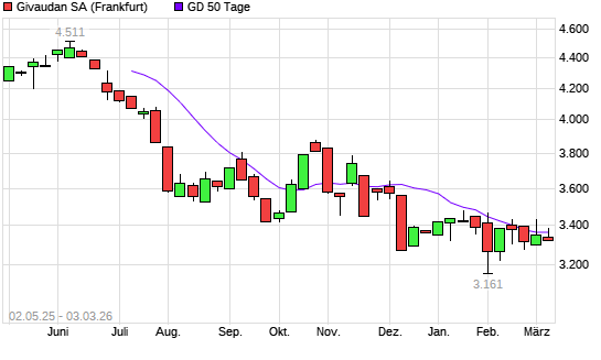 Mit dem Anstieg auf 3.383,00 EUR hat die Givaudan-Aktie am 02.03.2026 die 50-Tage-Linie nach oben gekreuzt.