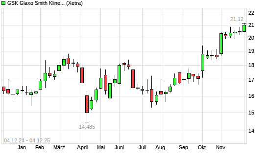 Mit dem Anstieg auf 20,91 EUR hat die GlaxoSmithKline-Aktie (ISIN GB00BN7SWP63) am 03.12.2025 ein neues 12-Monats-Hoch erreicht und damit den Kurs vom 02.12.2025 eingestellt.