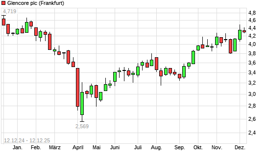 Mit dem Anstieg auf 4,41 EUR hat die Glencore-Aktie (ISIN JE00B4T3BW64) am 11.12.2025 ein neues 6-Monats-Hoch erreicht und damit den Kurs vom 04.12.2025 eingestellt.