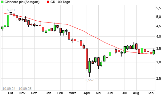 Mit dem Anstieg auf 3,48 EUR hat die Glencore-Aktie am 09.09.2025 die 100-Tage-Linie nach oben gekreuzt.