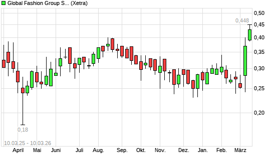 Mit dem Anstieg auf 0,43 EUR hat die Global Fashion Group-Aktie (ISIN LU2010095458) am 09.03.2026 ein neues 12-Monats-Hoch erreicht und damit den Kurs vom 15.08.2025 eingestellt.