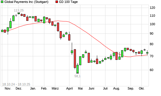 Mit dem Rücksetzer auf 70,56 EUR hat die Global Payments-Aktie am 17.10.2025 die 100-Tage-Linie nach unten gekreuzt.