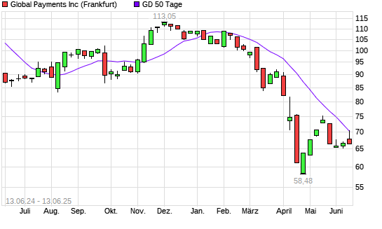 Mit dem Rücksetzer auf 68,72 EUR hat die Global Payments-Aktie am 12.06.2025 die 50-Tage-Linie nach unten gekreuzt.