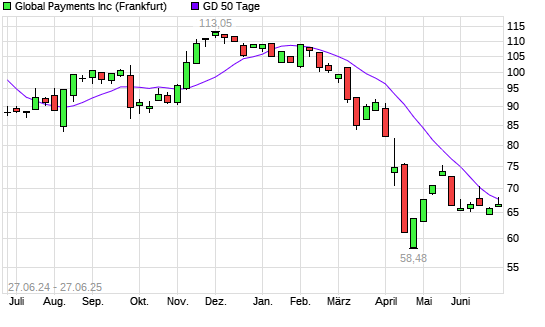 Mit dem Rücksetzer auf 66,58 EUR hat die Global Payments-Aktie am 26.06.2025 die 50-Tage-Linie nach unten gekreuzt.
