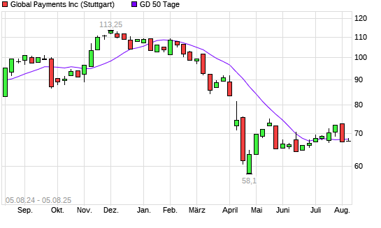 Mit dem Rücksetzer auf 67,50 EUR hat die Global Payments-Aktie am 04.08.2025 die 50-Tage-Linie nach unten gekreuzt.
