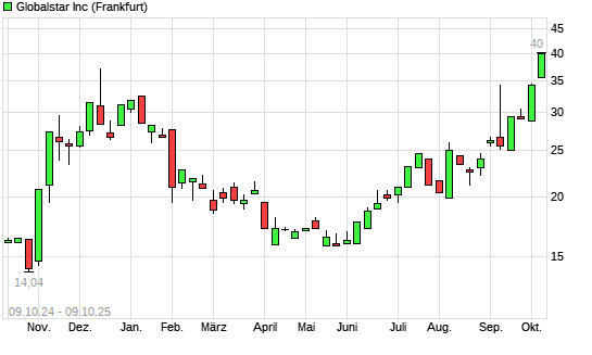 Mit dem Anstieg auf 39,20 EUR hat die Globalstar-Aktie (ISIN US3789735079) am 08.10.2025 ein neues 10-Jahres-Hoch erreicht und damit den Kurs vom 06.10.2025 eingestellt.