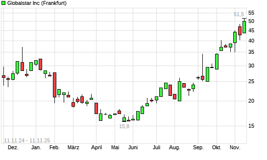 Mit dem Anstieg auf 50,00 EUR hat die Globalstar-Aktie (ISIN US3789735079) am 10.11.2025 ein neues 10-Jahres-Hoch erreicht und damit den Kurs vom 31.10.2025 eingestellt.