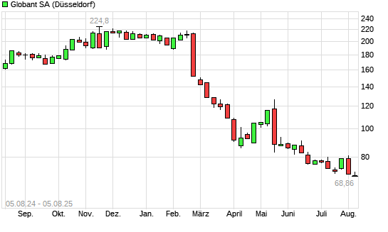 Mit dem Rücksetzer auf 69,08 EUR hat die Globant-Aktie (ISIN LU0974299876) am 04.08.2025 ein neues 5-Jahres-Tief erreicht und damit den Kurs vom 16.07.2025 eingestellt.