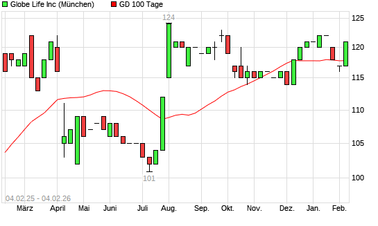 Mit dem Anstieg auf 121,00 EUR hat die Globe Life-Aktie am 03.02.2026 die 100-Tage-Linie nach oben gekreuzt.