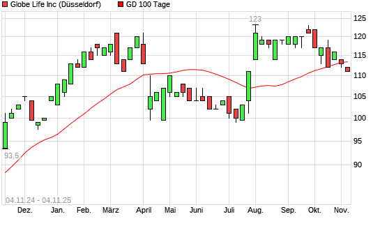 Mit dem Rücksetzer auf 113,00 EUR hat die Globe Life-Aktie am 03.11.2025 die 100-Tage-Linie nach unten gekreuzt.