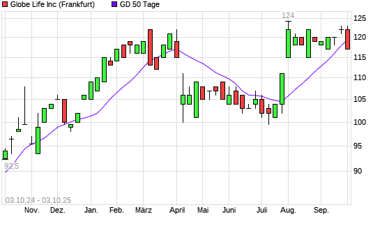Mit dem Rücksetzer auf 118,00 EUR hat die Globe Life-Aktie am 02.10.2025 die 50-Tage-Linie nach unten gekreuzt.