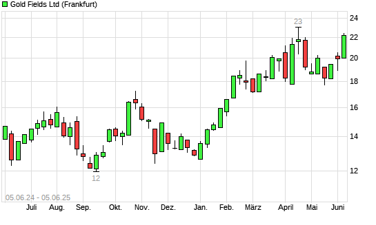 Mit dem Anstieg auf 22,30 EUR hat die Gold Fields-Aktie (ISIN ZAE000018123) am 04.06.2025 ein neues All-Time-High erreicht und damit den Kurs vom 16.04.2025 eingestellt.
