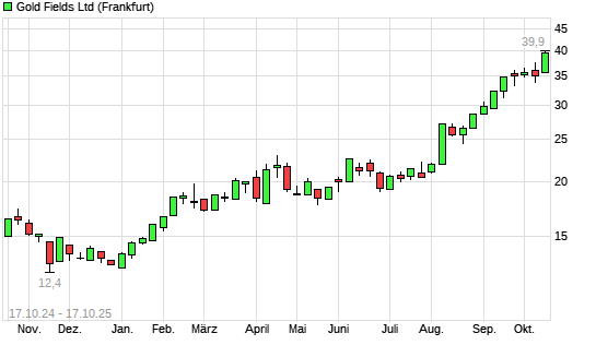 Mit dem Anstieg auf 39,90 EUR hat die Gold Fields-Aktie (ISIN ZAE000018123) am 16.10.2025 ein neues All-Time-High erreicht und damit den Kurs vom 15.10.2025 eingestellt.