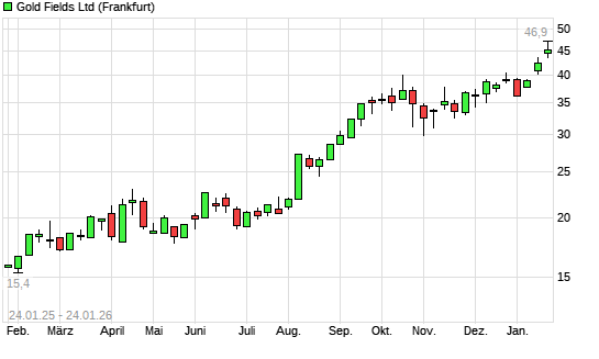 Mit dem Anstieg auf 45,30 EUR hat die Gold Fields-Aktie (ISIN ZAE000018123) am 23.01.2026 ein neues All-Time-High erreicht und damit den Kurs vom 20.01.2026 eingestellt.