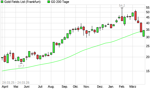 Mit dem Anstieg auf 34,70 EUR hat die Gold Fields-Aktie am 23.03.2026 die 200-Tage-Linie nach oben gekreuzt.