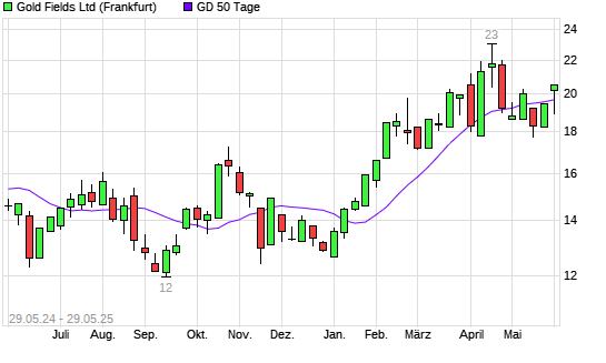 Mit dem Anstieg auf 20,20 EUR hat die Gold Fields-Aktie am 28.05.2025 die 50-Tage-Linie nach oben gekreuzt.