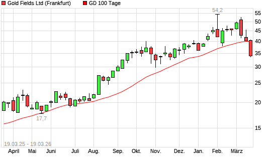 Mit dem Rücksetzer auf 37,10 EUR hat die Gold Fields-Aktie am 18.03.2026 die 100-Tage-Linie nach unten gekreuzt.