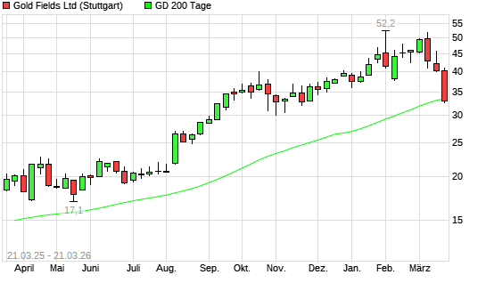 Mit dem Rücksetzer auf 33,40 EUR hat die Gold Fields-Aktie am 20.03.2026 die 200-Tage-Linie nach unten gekreuzt.