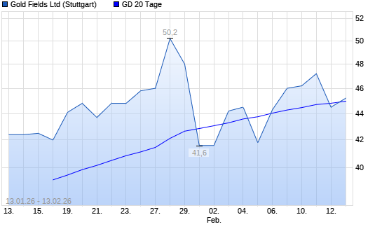 Mit dem Rücksetzer auf 45,00 EUR hat die Gold Fields-Aktie am 12.02.2026 die 20-Tage-Linie nach unten gekreuzt.Die Gold Fields-Aktie befindet sich seit dem 09.01.2025 im langfristigen Aufwärtstrend ...weiterlesen