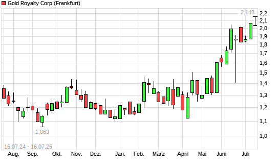 Mit dem Anstieg auf 2,08 EUR hat die Gold Royalty Corp-Aktie (ISIN CA38071H1064) am 15.07.2025 ein neues 12-Monats-Hoch erreicht und damit den Kurs vom 11.07.2025 eingestellt.