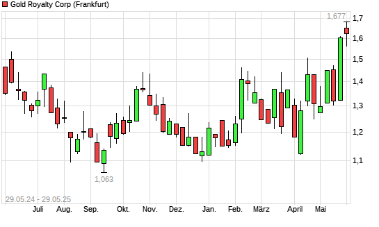 Mit dem Anstieg auf 1,66 EUR hat die Gold Royalty Corp-Aktie (ISIN CA38071H1064) am 28.05.2025 ein neues 6-Monats-Hoch erreicht und damit den Kurs vom 26.05.2025 eingestellt.
