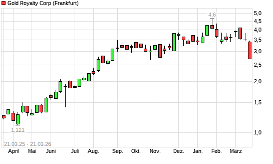 Mit dem Rücksetzer auf 2,70 EUR hat die Gold Royalty Corp-Aktie (ISIN CA38071H1064) am 20.03.2026 ein neues 6-Monats-Tief erreicht und damit den Kurs vom 07.11.2025 eingestellt.