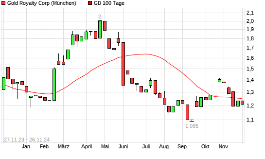 Mit dem Rücksetzer auf 1,19 EUR hat die Gold Royalty Corp-Aktie am 25.11.2024 die 100-Tage-Linie nach unten gekreuzt.