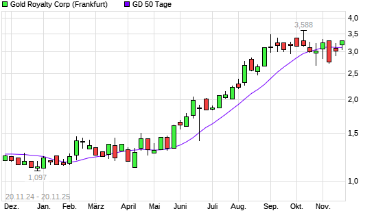 Mit dem Anstieg auf 3,30 EUR hat die Gold Royalty Corp-Aktie am 19.11.2025 die 50-Tage-Linie nach oben gekreuzt.Die Gold Royalty Corp-Aktie befindet sich seit dem 10.04.2025 im langfristigen ...weiterlesen