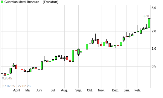 Mit dem Anstieg auf 2,88 EUR hat die Golden Metal Resources plc-Aktie (ISIN GB00BPQY8R36) am 26.02.2026 ein neues All-Time-High erreicht und damit den Kurs vom 25.02.2026 eingestellt.