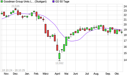Mit dem Rücksetzer auf 18,57 EUR hat die Goodman Group Units-Aktie am 17.10.2025 die 50-Tage-Linie nach unten gekreuzt.
