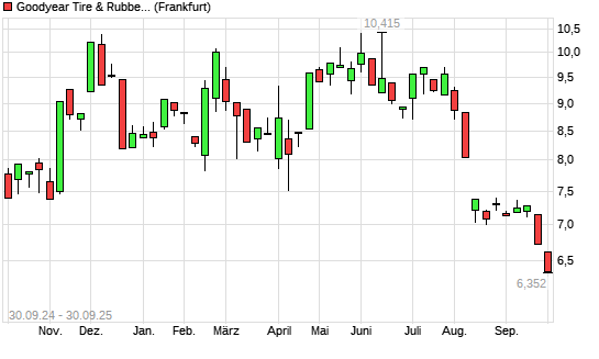 Mit dem Rücksetzer auf 6,47 EUR hat die Goodyear-Aktie (ISIN US3825501014) am 29.09.2025 ein neues 5-Jahres-Tief erreicht und damit den Kurs vom 29.09.2020 eingestellt.