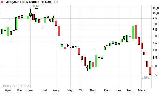 Mit dem Rücksetzer auf 5,70 EUR hat die Goodyear-Aktie (ISIN US3825501014) am 18.03.2026 ein neues 5-Jahres-Tief erreicht und damit den Kurs vom 16.10.2025 eingestellt.