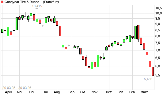 Mit dem Rücksetzer auf 5,56 EUR hat die Goodyear-Aktie (ISIN US3825501014) am 19.03.2026 ein neues 5-Jahres-Tief erreicht und damit den Kurs vom 18.03.2026 eingestellt.