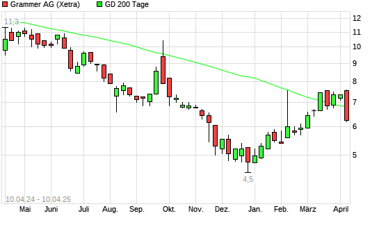 Mit dem Rücksetzer auf 6,30 EUR hat die Grammer-Aktie am 09.04.2025 die 200-Tage-Linie nach unten gekreuzt.