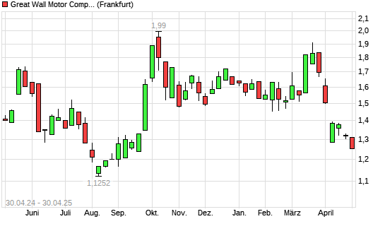 Mit dem Rücksetzer auf 1,28 EUR hat die Great Wall Motor Company-Aktie (ISIN CNE100000338) am 29.04.2025 ein neues 6-Monats-Tief erreicht und damit den Kurs vom 24.04.2025 eingestellt.