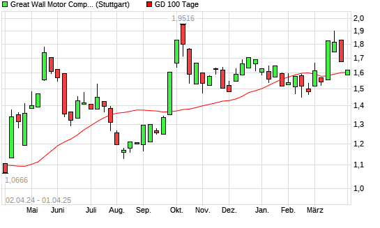 Mit dem Rücksetzer auf 1,60 EUR hat die Great Wall Motor Company-Aktie am 31.03.2025 die 100-Tage-Linie nach unten gekreuzt.