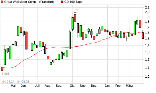 Mit dem Rücksetzer auf 1,53 EUR hat die Great Wall Motor Company-Aktie am 03.04.2025 die 100-Tage-Linie nach unten gekreuzt.