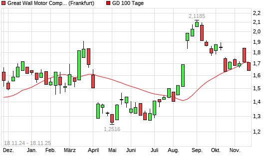 Mit dem Rücksetzer auf 1,71 EUR hat die Great Wall Motor Company-Aktie am 17.11.2025 die 100-Tage-Linie nach unten gekreuzt.