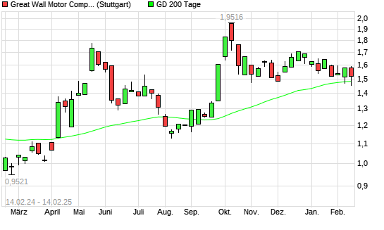 Mit dem Rücksetzer auf 1,46 EUR hat die Great Wall Motor Company-Aktie am 13.02.2025 die 200-Tage-Linie nach unten gekreuzt.
