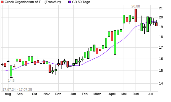 Mit dem Rücksetzer auf 19,27 EUR hat die Greek Organisation of Football Prognostics-Aktie am 16.07.2025 die 50-Tage-Linie nach unten gekreuzt.