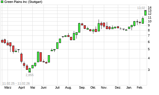 Mit dem Anstieg auf 12,42 EUR hat die Green Plains-Aktie (ISIN US3932221043) am 10.02.2026 ein neues 12-Monats-Hoch erreicht und damit den Kurs vom 09.02.2026 eingestellt.