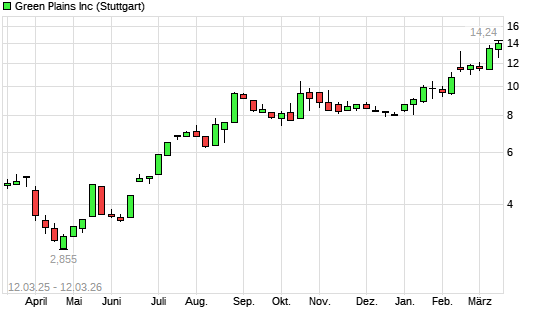 Mit dem Anstieg auf 13,50 EUR hat die Green Plains-Aktie (ISIN US3932221043) am 11.03.2026 ein neues 12-Monats-Hoch erreicht und damit den Kurs vom 06.03.2026 eingestellt.