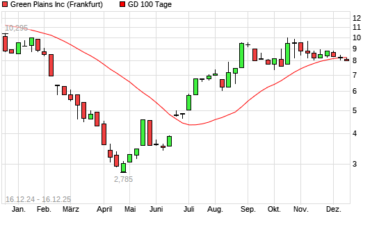 Mit dem Rücksetzer auf 8,21 EUR hat die Green Plains-Aktie am 15.12.2025 die 100-Tage-Linie nach unten gekreuzt.