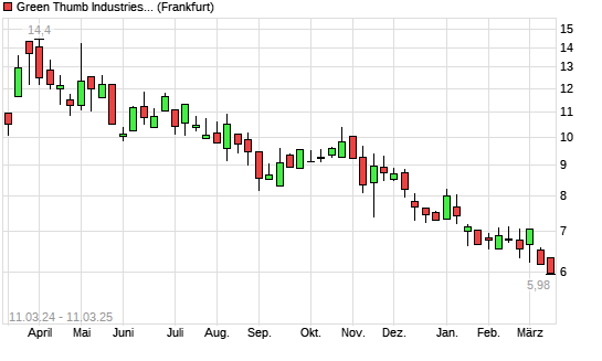 Mit dem Rücksetzer auf 6,14 EUR hat die Green Thumb Industries-Aktie (ISIN CA39342L1085) am 10.03.2025 ein neues 12-Monats-Tief erreicht und damit den Kurs vom 04.03.2025 eingestellt.