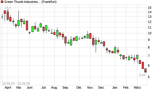 Mit dem Rücksetzer auf 5,49 EUR hat die Green Thumb Industries-Aktie (ISIN CA39342L1085) am 21.03.2025 ein neues 3-Jahres-Tief erreicht und damit den Kurs vom 20.03.2025 eingestellt.