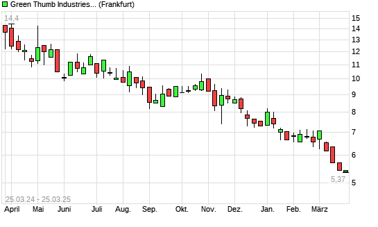 Mit dem Rücksetzer auf 5,40 EUR hat die Green Thumb Industries-Aktie (ISIN CA39342L1085) am 24.03.2025 ein neues 3-Jahres-Tief erreicht und damit den Kurs vom 21.03.2025 eingestellt.
