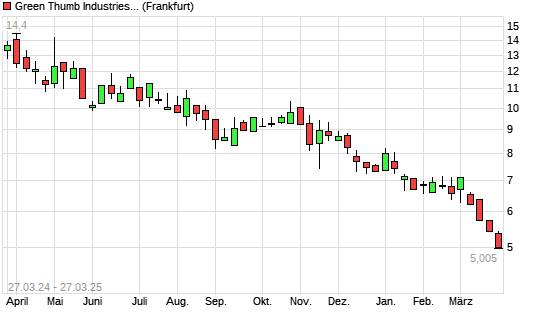 Mit dem Rücksetzer auf 5,06 EUR hat die Green Thumb Industries-Aktie (ISIN CA39342L1085) am 26.03.2025 ein neues 3-Jahres-Tief erreicht und damit den Kurs vom 25.03.2025 eingestellt.
