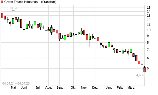 Mit dem Rücksetzer auf 4,92 EUR hat die Green Thumb Industries-Aktie (ISIN CA39342L1085) am 03.04.2025 ein neues 5-Jahres-Tief erreicht und damit den Kurs vom 15.04.2020 eingestellt.