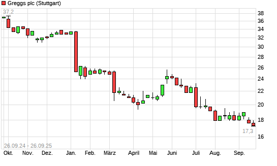 Mit dem Rücksetzer auf 17,80 EUR hat die Greggs-Aktie (ISIN GB00B63QSB39) am 25.09.2025 ein neues 3-Jahres-Tief erreicht und damit den Kurs vom 23.09.2025 eingestellt.