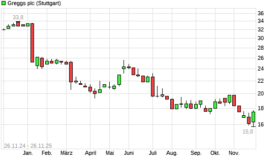Mit dem Rücksetzer auf 16,40 EUR hat die Greggs-Aktie (ISIN GB00B63QSB39) am 25.11.2025 ein neues 5-Jahres-Tief erreicht und damit den Kurs vom 24.11.2025 eingestellt.
